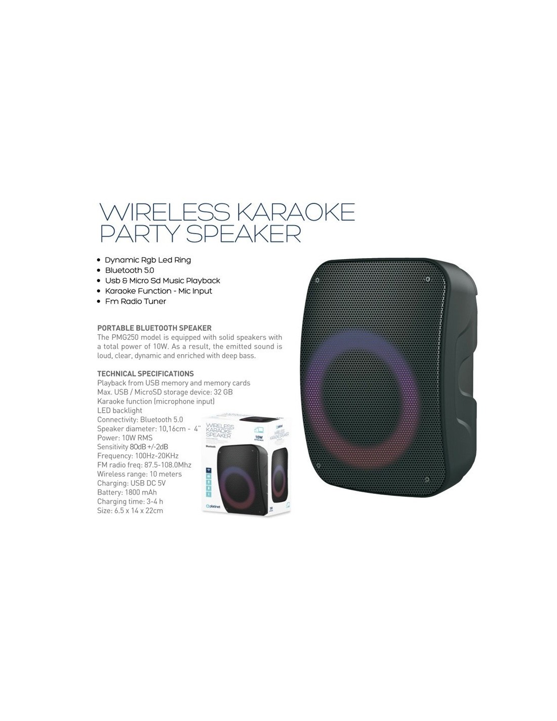 PLATINET PMG250 es un gran altavoz portátil inalámbrico Bluetooth con función de karaoke (micrófono incluido), multiconectividad y retroiluminación LED.