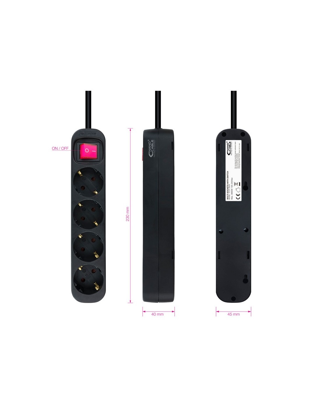 REGLETA 4 TOMAS NANO CABLE CON 1.4M PROTECCION, INTERUPTOR PN: 10.37.0004-BK EAN: 8433281010178