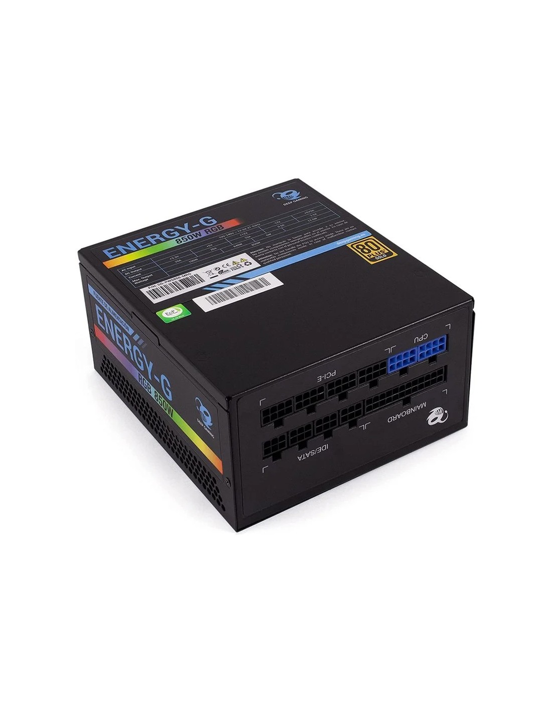 Nueva fuente de alimentación Deep Gaming Energy-G con certificado 80 Plus Gold, 850W de potencia, diseño Full Modular, ventilador ultra silencioso e iluminación ARGB configurable. Compatible con gráficas Nvidia RTX 3000 y AMD RX6: disfruta de unos gráficos al máximo nivel en las gráficas más potentes del mercado.
