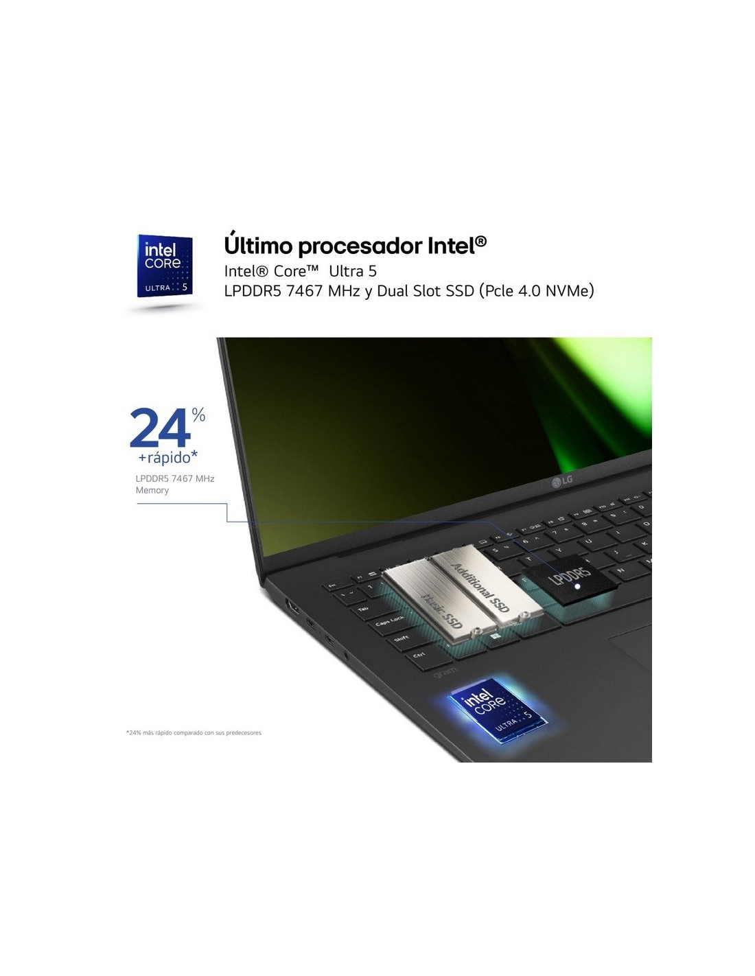 LG gram ha sido certificado por Intel enla plataforma EvoTM al incorporar Procesadores y gráficas de última generación para trabajar con contenido 4K UHD con máxima fluidez. Incorpora una memoria RAM ultra rápida de 1.24x LPDDR5X, disco duro SSD NVMe de 4ª generación con doble ranura para ampliar; permitiendo añadir recursos a tu equipo cuando lo necesites. Alta conectividad con diversos tipos de puertos y Bluetooth., que permiten mayor usabilidad y alta velocidad de transferencia de datos y compatibilidad en el tiempo con diversos periféricos.