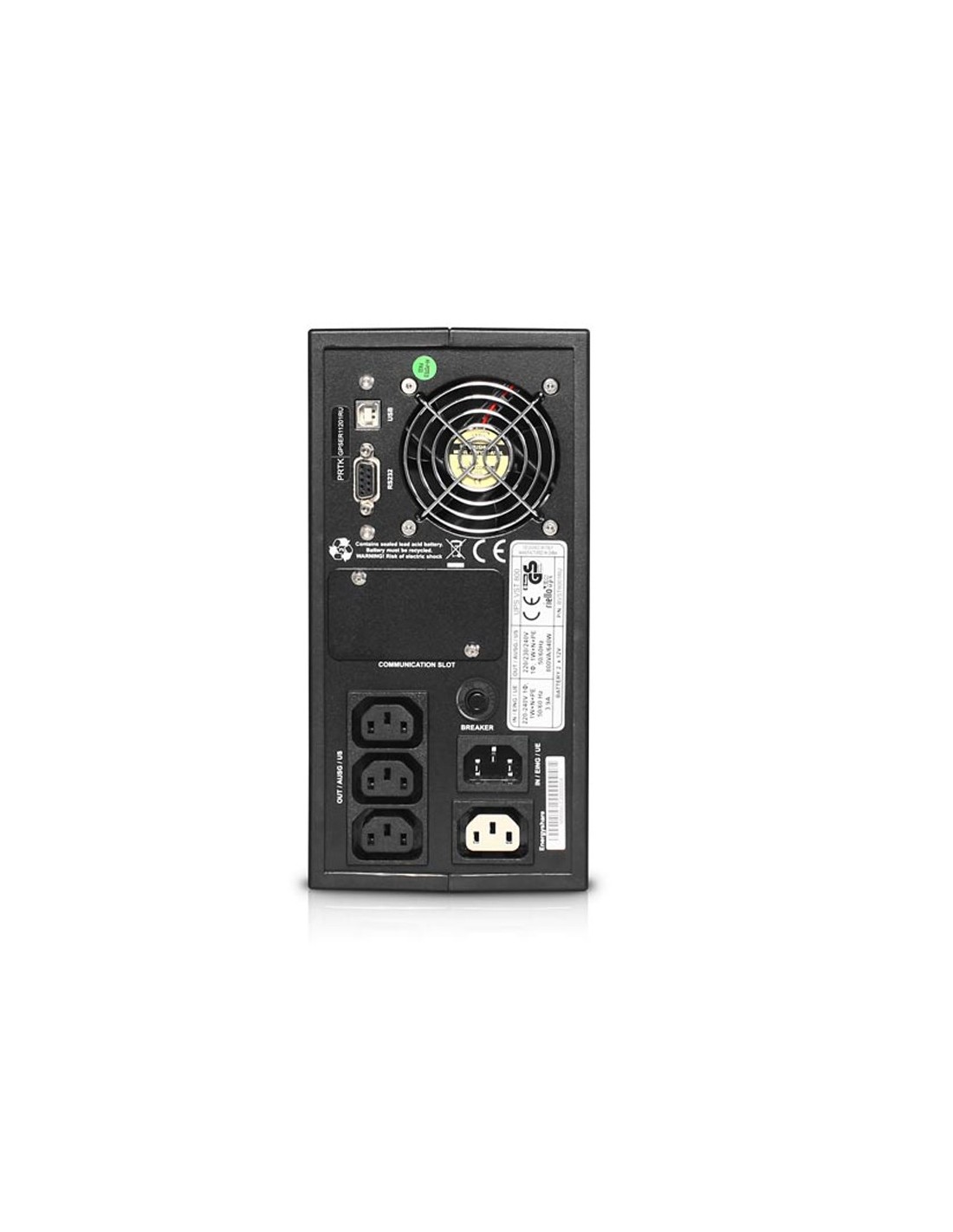 ENTRADAPotencia evaluada800 VATensión230 VcaFrequencia50 o 60 Hz rango automáticoTolerancia de frecuencia± 5%SALIDA y SALIDA INVERSORPotencia evaluada800 VAPotencia activa640 WNúmero de fases1Forma de ondaSinusoidalFrequencia50 o 60 Hz rango automáticoBATERIATipode plomo-ácido sellada sin necesidad de mantenimientoTiempo de recarga4÷6 hCONDICIONES AMBIENTALESColorGris oscuro RAL 7016Conformidad de seguridadEN 62040-1:2008; EN 62040-1/EC:2009; EN 62040-1/A1:2013 and Directive 2014/35/EUConformidad EMCEN 62040-2 and Directive 2014/30/EUGrado de protección2Sobretensión admitidaIEC 801-5 6 KV 1.2 / 50 μs; 3KA 8/20 μs diferencialProteccionessobrecorriente - cortocircuito - sobretensión - caída de tensión - térmica - excesiva descarga delas bateríasRuido<40 dBA a 1 mTemperatura defuncionamiento0 ÷ 40 °CHumedad relativa<95% sin condensaciónTomas de salida4 IEC 10ADATOSPeso10,5 kgDimensiones (al an fo)247x120x443 mm